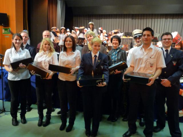 Die sechs jungen Musikerinnen und Musiker Felizitas Balzer, Sina Eha, Anne Heinzler, Matthias Rieger und Max Heinzler wurden anschließend für 10-jährige aktive Mitgliedschaft geehrt und erhielten hierfür eine Ehrennadel und ein Weinpräsent. Außerdem ernannte Vorsitzender Stefan Bauser die passiven Mitglieder Jutta Dreher, Sabine Netzer, Klaus Faulhaber und Peter Schüßler zu Ehrenmitgliedern der Stadtkapelle.